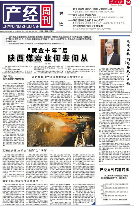 《陜西日報》2013年5月3日14版進(jìn)入四月,全國煤炭市場寒潮依舊,煤炭滯銷、庫存增加、價格持續(xù)下滑:以5500達(dá)卡動力煤為例,噸煤同比平均下降140元至165元。3月份全國煤炭市場景氣指數(shù)為-28.5,比二月下滑9.4個基點,反映出煤炭市場依然偏冷且有所加劇。陜西作為全國排名第三的產(chǎn)煤大省,不可避免受到煤炭市場寒潮的影響……“黃金十年后”陜西煤炭業(yè)何去何從記者 賀韜 分析…
