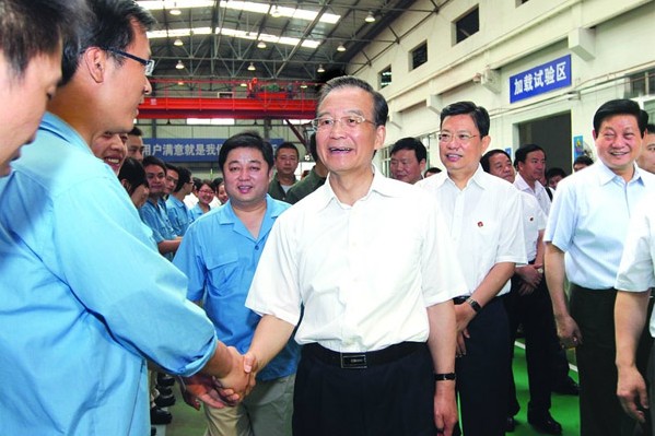 7月10日,中共中央政治局常委、國務(wù)院總理溫家寶在西安煤礦機(jī)械有限公司調(diào)研。7月9日至10日,中共中央政治局常委、國務(wù)院總理溫家寶在省委書記趙樂際和省委副書記、省長趙正永分別陪同下,先后來到我省咸陽、西安等地,訪農(nóng)戶、看超市,深入工廠農(nóng)村、物流公司,廣泛聽取基層干部群眾意見,就當(dāng)前經(jīng)濟(jì)運(yùn)行有關(guān)問題調(diào)研,并在西安主持召開山西、河南、四川、陜西四省經(jīng)濟(jì)形勢(shì)座談…