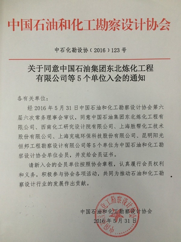 2016年5月31日,中國(guó)石油和化工勘察設(shè)計(jì)協(xié)會(huì)向我公司頒發(fā)了會(huì)員證,我司正式成為該協(xié)會(huì)會(huì)員單位。